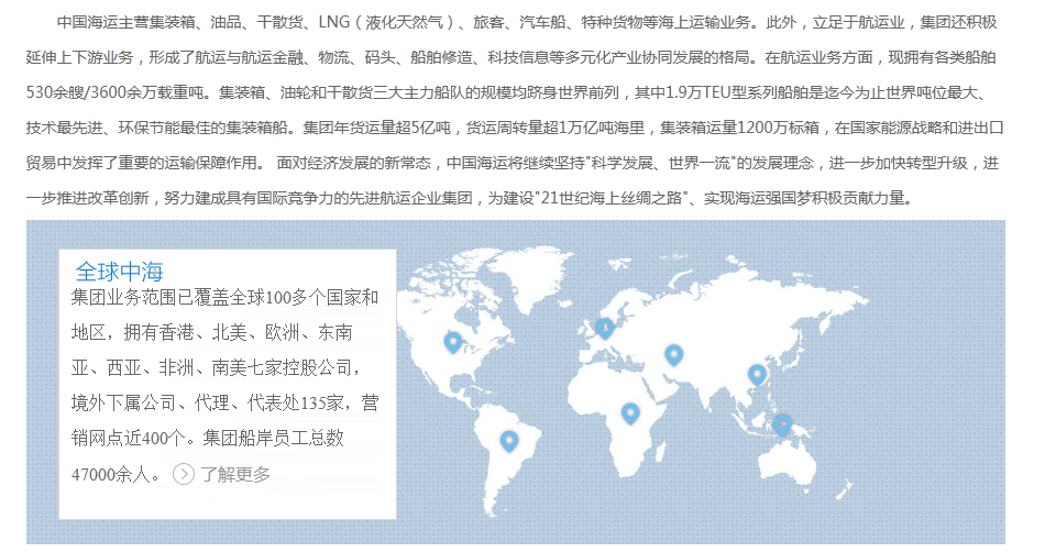 近年来,中国海运围绕航运主业,积极拓展码头经营、综合物流、船舶代理、环球空运、船舶修造、集箱制造、船员管理、供应贸易、金融投资、信息技术、交通科技等相关业务领域,已形成完整的业务体系。集团业务范围已覆盖全球100多个国家和地区,拥有香港、北美、欧洲、东南亚、西亚、非洲、南美七家控股公司,境外下属公司、代理、代表处135家,营销网点近400个。集团船岸员工总数47000余人。
